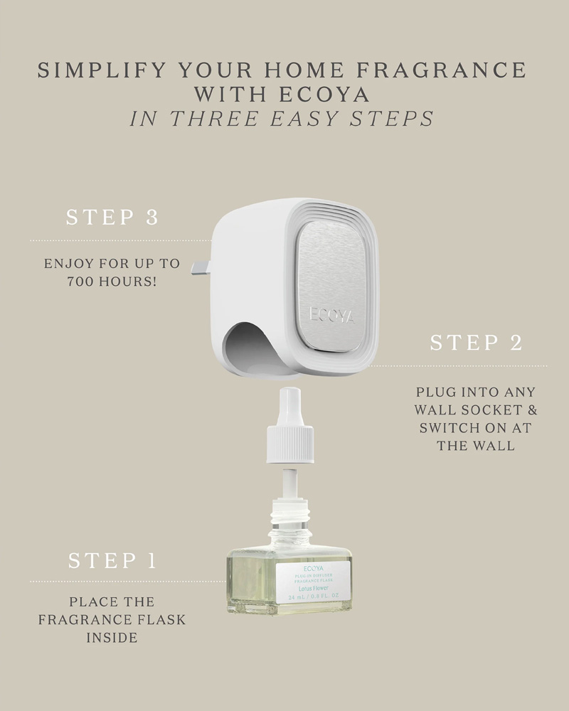 The ECOYA Plug-In Diffuser simplifies home fragrance; Plug your diffuser into any wall socket and enjoy your favourite ECOYA fragrances for up to 700 hours.